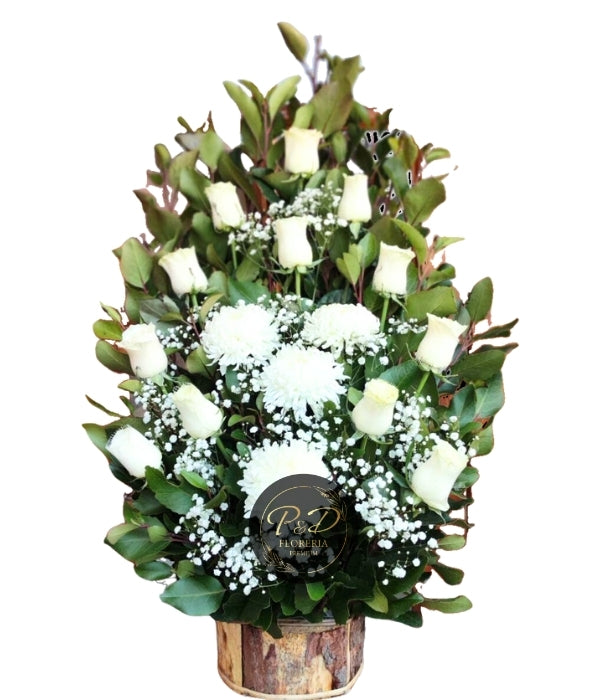 Arreglo floral con base de estilo rústico, con flores mixtas en tonos cálidos o naturales. Ideal para decoración de eventos, entradas o altares.