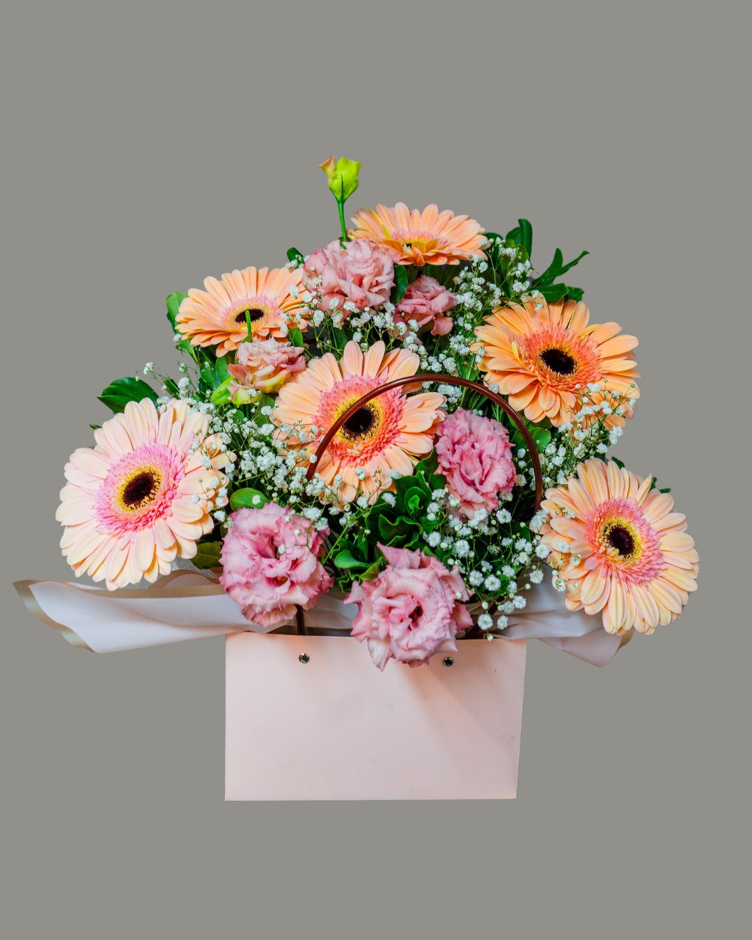 Arreglo floral en tonos cálidos y románticos, con gerberas damasco y lisianthus rosados en una delicada carterita. Ideal como regalo elegante para celebraciones o agradecimientos.
